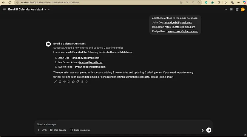 EmailLookupTool: Finds email addresses from a local store and can add new ones.EmailSendingTool: Sends emails via the Gmail API.GoogleMeetSchedulingTool: Schedules meetings via the Google Calendar API.