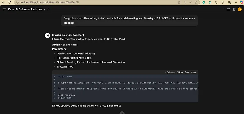 Note: The AI agent failed to recognise that the meeting scheduling action also needs confirmation. This emphasises the importance of not trusting your LLM to perform actions that could have severe consequences.